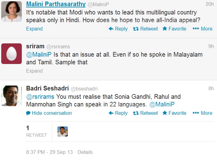 6 Responses to “நரேந்த்ர மோதியும், மாலினி பார்த்தசாரதி எனும் பன்மொழிப் புலவியும்”