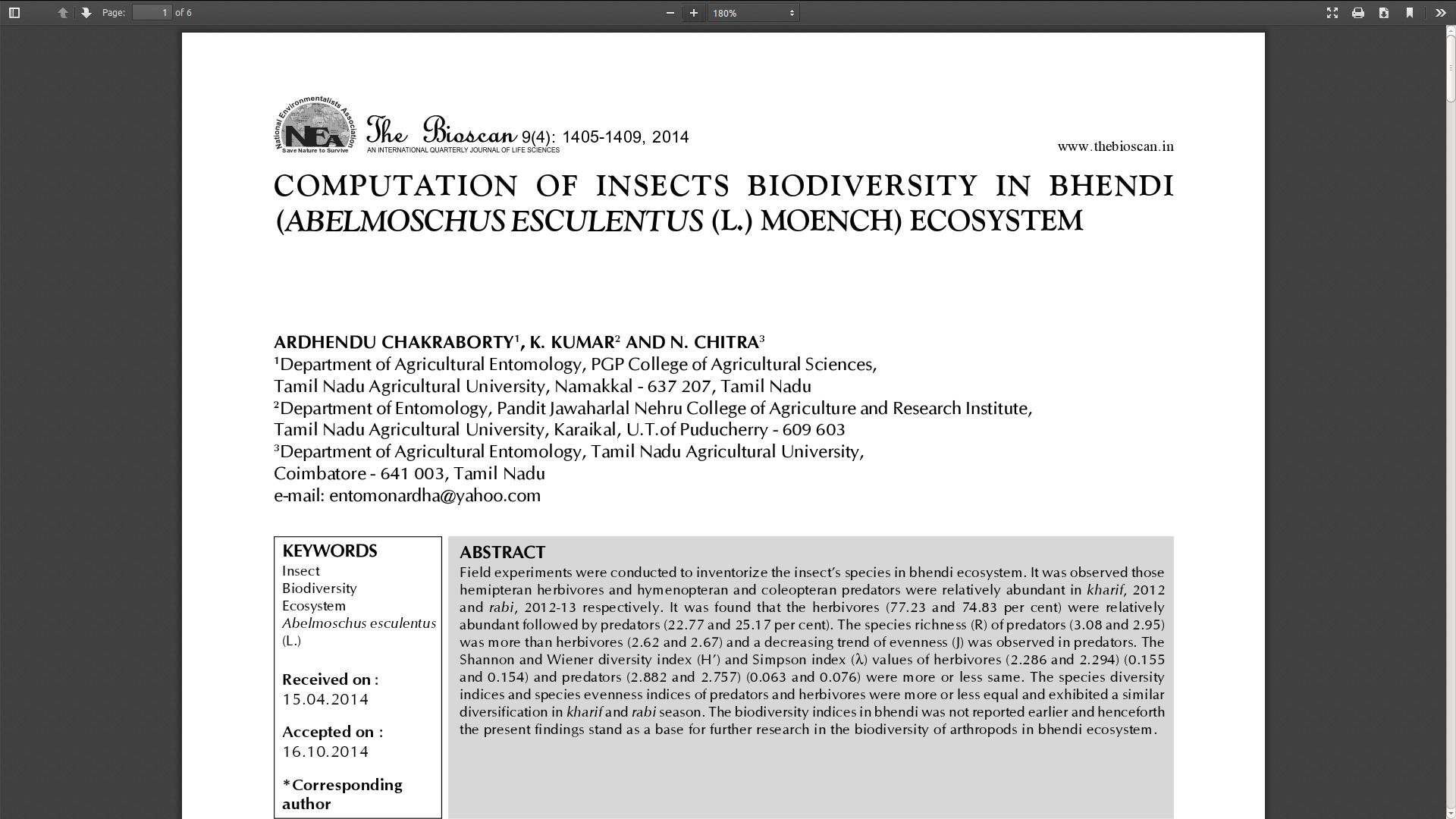 இன்னொன்று – வெண்டைக்காய்ச் செடியைச் சுற்றியுள்ள பூச்சிவகைகளைப் பற்றிய ஒரு பட்டியலிடலைச் செய்திருக்கிறது.