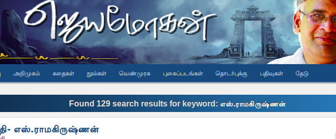 ஆக, தன் முயற்சியில் சற்றும் மனம் தளராத நான், ஒரு ‘இன்வெஸ்டிகேடிவ்’ அக்கப்போர்க் காரனாதலால், கமுக்கமாக அவர் தளத்திற்குப் போய் ‘எஸ்.ராமகிருஷ்ணன்’ என்று தேடினேன். Screenshot from 2015-07-10 13:09:03 ஆ! குறைந்த பட்சம் 129 பதிவுகளை எஸ்.ராமகிருஷ்ணன் தொடர்பாக எழுதியிருக்கும் இந்த மனிதர், ஏன் எஸ்ராவின் பிரச்சினைகளைக் கண்டுகொள்ள மாட்டேனென்கிறார்? எனக்குப் புரியவில்லை.