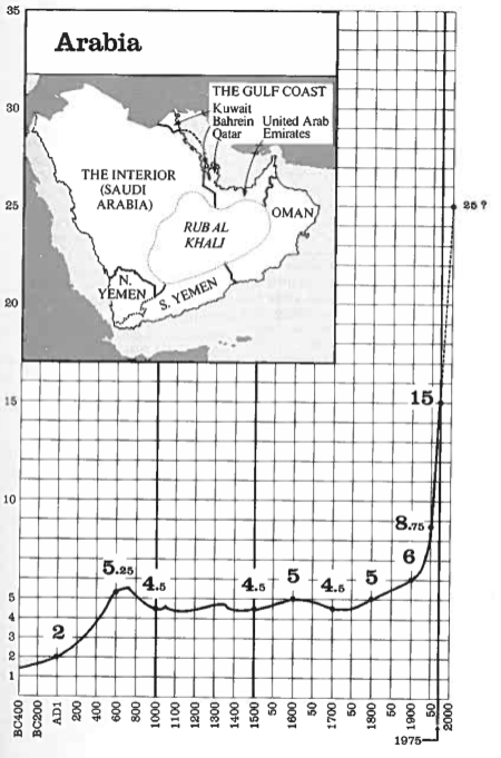 • மொஹெம்மத் இறந்த சமயம் (கிபி 744) அவர் நாட்டில் இருந்த மொத்த மக்கள்தொகை (படுகேவலமாக நடத்தப்பட்ட ஆப்பிரிக்க, இஸ்ரேலிய/யூத, க்றிஸ்தவ அடிமைகள் உட்பட): சுமார் 21 லட்சம். பாவப்பட்ட அடிமைகளைச் சேர்க்காமல் இருந்தால், இந்த எண்ணிக்கை சுமார் 13.5 லட்சத்துக்கு இறங்கி விடும். ஒரு பொருத்திப் பார்த்தலுக்காக – சென்னையின் தற்போதைய, 2015 மக்கள்தொகை, சுமார் 50 லட்சம். (அப்போதைய பெரிய நகரமான மக்காவின் மக்கள்தொகையே,
