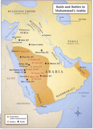 பழுப்பு நிறப் பகுதி மொஹெம்மத் நபி அவர்களின் கடைசிக்காலத்தில் அவர் ஆக்கிரமிப்பில் இருந்த பகுதி - இது அரேபியாவின் மொத்த விஸ்தீரணத்தில் பாதிக்கும் கீழ்!