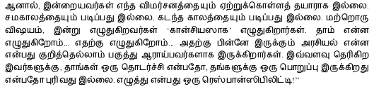 …நிறைமாதக் கர்ப்பிணிப் பெண்ணைப் போல முன்சரியும் வயிற்றை வைத்துக்கொண்டு, ஆகவே இந்தக் கூறுகெட்ட புவியீர்ப்பு விசைக்குப் பலியாகி ரஜினியார் காலடியில் டமாரென்று வீழ்ந்து சரணாகதியாகிவிடாமல் தொந்தியை இழுத்துப் பிடித்து மூச்சைக் கட்டி, நெஞ்சினை நிமிர்த்தப் பிரம்மாண்டப் பிரம்மப் பகீரதப் பிரயத்தனம் செய்துகொண்டிருக்கும் என்னருமைப் பேராசானைக் காணக்கண்கோடி வேண்டும்தானே! தானத் தந்தனத் தந்தானே!!