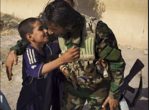 (மீட்கப் பட்ட ஒரு மோஸுல் குழந்தை – இராக்கிய ராணுவக்காரரை அரவணைக்கிறது; இக்குழந்தைகளுக்கு எப்படியாவது நல்ல எதிர்காலம் அமையவேண்டும்)