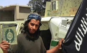 (ஒரு ஐரோப்பிய ஜிஹாதி – ஒரு கையில் மதப்புத்தகம், இன்னொரு கை இஸ்லாமியதேச குண்டரமைப்பின் கொடியைச் சுட்டுகிறது)