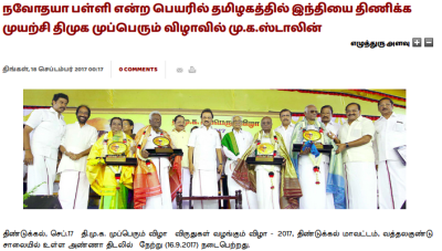 (சரி, தலைவர்தான் வாய் கூசாமல் பொய்சொல்கிறார் அல்லது அமோகமாக உளறுகிறார் என்றால் – பொதுவாகவே மூளையுள்ளவரும் கொஞ்சமாவது கல்வியில் ஈடுபாடுள்ளவருமான திருச்சி சிவா போன்றவர்கள், உளறல்களை எதிர்கொள்ளாமல், இளித்துக்கொண்டே புகைப்படத்துக்கு ‘போஸ்’ கொடுப்பது இன்னமும் சோகம்! தங்கம் தென்னரசு போன்றவர்கள் (எனக்குத் தெரிந்து இவர் ஒரு திராவிட விதிவிலக்கு – உண்மையாகவே ஒரளவாவது தமிழகம்மீதும் கல்வியின்மீதும் கரிசனம் உள்ளவர்) எல்லாம் திமுக-வில் உட்கார்ந்துகொண்டு என்னதான் செய்கிறார்கள்? (இவர் மேடையில் இல்லை என நினைக்கிறேன், தப்பித்துக்கொண்டுவிட்டாரோ?))