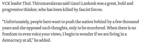 திருமாவளவன் – மேதாவித்தனமாகவும் மனிதவுரிமைத்தனமாகவும் கௌரிலங்கேஷ் இறப்பு குறித்து ‘எல்லாம் தெரிந்த ஏகாம்பரத்தனத்துடன்’ பேசியபோது – அவருக்குக் கூசவில்லை. ஏனெனில் அவர் ஒரு அரசியல்வாதி. ஆக, அவருடைய கூச்சமற்ற நாக்கு அப்படியும் இப்படியும் சுழலலாம்.