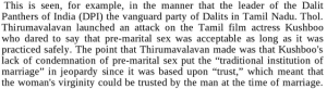 அச்சமயம் – பொது மேடைப்பேச்சுகளிலும் தொலைக்காட்சி விவாதங்(!)களிலும் மறுபடியும் மறுபடியும் திருமாவளவன் சொன்னதன் சாராம்சம் + என் குறிப்பு: ‘திருமணம் எனும் பாரம்பரியத்தை குஷ்பூ கேவலப்படுத்திவிட்டார். திருமணத்தின் அடிப்படையே நம்பிக்கைதான். அதாவது, பெண்கள் ‘கற்புடை மகளிராக’ இந்தத் திருமணத்துக்கு வந்து சேர்ந்தால் தான் நம் பாரம்பரியம் உருப்படும்; திருமணத்தின்போது ஒரு ஆணால், தன்னை மணந்த பெண்ணின் கற்பினை உறுதிசெய்யப்பட முடியாது என்றால், நம் பாரம்பரியம் பாதிக்கப்படும், …‘ வகையறா.