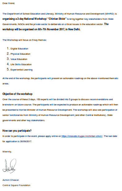 The Department of School Education and Literacy, Ministry of Human Resource and Development (MHRD) is organising a 2-day National Workshop/ “Chintan Shivir” to bring together key stakeholders from State Governments, NGOs and the private sector to deliberate on critical issues in the education sector. The workshop will be organised on 6th-7th November 2017, in New Delhi.