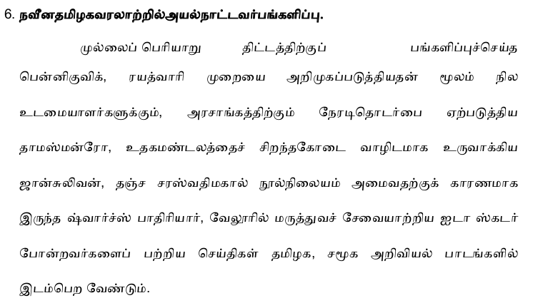 5. நாயன்மார்களா, ஆழ்வார்களா? கோவில்களா குளங்களா ஏரிகளா? எதுவும் இருந்திருக்கவில்லை – ஆக அவை பங்கும் அளிக்கவில்லை. அதனால் அவை பாடத்திட்டத்திலும் இல்லை. லெமூரியாவுக்குப் பிறகு ஏதாவது உருப்படியாக ஏற்பட்டதற்கு – வந்த சமண பௌத்த சமயங்கள்தாம் காரணம்! பின்னர் அப்ரஹாமிய மதங்கள்…