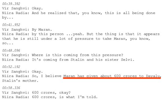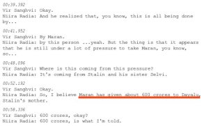 நீரா ராடியா (அடிப்படையில் இவரொரு தரகர், மக்கள்தொடர்பு வகை அதிகாரியாக இருந்தவர்; தற்போது மருத்துவமனைச் சங்கிலி ஒன்றை நடத்திக்கொண்டிருக்கிறார்) – வீர் ஸங்க்வி (இவர் ஒரு ஊடகப்பேடி, காங்கிரஸ் அடிவருடி) அவர்களிடையே 23 மே, 2009 அன்று நடந்த உரையாடலின் ஒரு பகுதி கீழே – இதில்தான் இந்த அறுநூறு கோடிக் குடும்ப லஞ்சம் பற்றிய குறிப்பு வருகிறது.