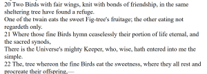 ஆக, எனக்கு இப்படி கிளி மான் தேன் என்றெல்லாம் படித்ததாக நினைவில்லையே, வெறுமனே பறவைகள் (+அழகான இறக்கைகள் உடையவை) என்று மட்டும்தானே இருந்தது என மறுபடியும், என் நூலகத்திலுள்ள சிலபல பிரதிகளைப் புரட்டினேன்.