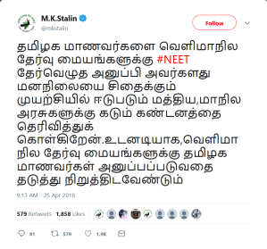 அதாவது – ஏறத்தாழ, வெளி மாநிலம் சென்று தேர்வு எழுதமுயலும் பாவப்பட்ட தமிழ்ப் பிள்ளைகளை மிரட்டுகிறீர்கள். அவர்களை மேற்படிப்பு படிக்கவிடாமல் திராவிட உதிரிகளாக மாற்ற நினைக்கிறீர்கள்! அவர்கள் எதிர்காலத்தைக் குலைத்து, தமிழகத்துக்கே துரோகம் செய்கிறீர்கள்!