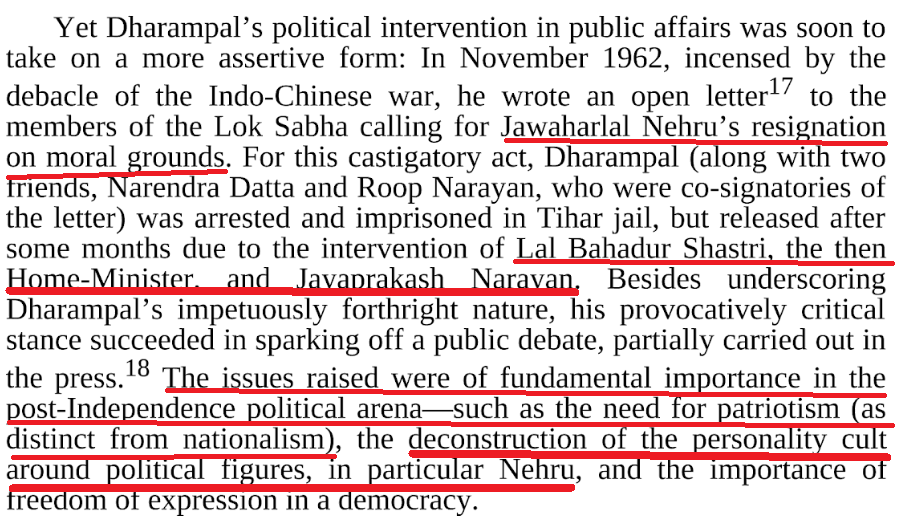 The thing is that, though the immediate context for the circulated letter (dated 21st November, 1962) was the China debacle, Dharampal and Narendra Datta were more bothered about the emergence of personality cult around Nehru and curbing of freedom of expression. [3]