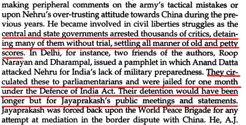 The 1962 emergency (you have not mentioned there was an emergency when Darampal’s letter was written) and 1976 emergency are different in all respects. I don’t have anything to say about Darampal’s (or your own) personal opinions about Nehru. But the arrest of Darampal was the need of the hour. It was not the proper time to expose the incompetence of the PM when the nation was facing the war. To be more specific, HAD FACED the war since ceasefire had been declared one or two days before the letter. (Had the chances of end of the war been remote, that letter can be justified at least halfheartedly.)