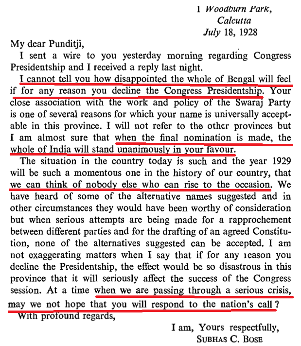 Now, Subhas Chandra Bose (who could have been a strong contender for the post) was rooting for Motilalji’s Presidentship for 1928 INC elections – as in the extract below.