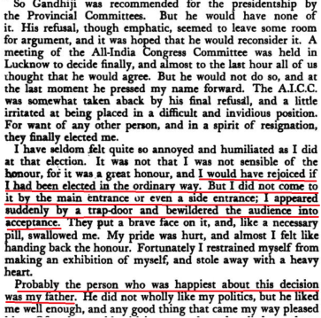 He did feel that (at least he recorded it this way) he “did not come to it [the INC Presidentship] by the main entrance or even a side entrance; I appeared suddenly by a trap-door and bewildered the audience into acceptance.”