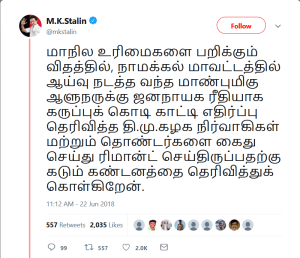 அண்மையில் எம் திராவிட முன்னேற்றக்கழகக் குஞ்சாமணி அடலேறுகள், ஆர்ப்பரித்தெழுந்து தமிழக ஆளுநர் காரின்மீது செருப்புவீசி தங்கள் திராவிடத் தினவைத் தீர்த்துக் கொண்டதும், அவர்கள் கைதுசெய்யப்பட்டதற்குக் கண்டனம் தெரிவித்து – திமுக செயல் தலைவரும், 65 வயதானாலும் நிரந்தர இளைஞரணிச் செயலாளருமாகத் தொடரும் இசுடாலினாராகிய நான், கொஞ்சம் கமுக்கமாக, செருப்புவீச்சைக் குறிப்பிடாமல் கீழ்கண்டதுபோல அறிக்கை விட்டதும் – இதனால் தமிழகமே வெட்கித் தலை குனிவதும் நமக்குத் தெரியும்.