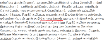 பின்னர் “horizontal-ஆக உட்கார்ந்து(!)” டர்புர் என்றெல்லாம் கலைச்சொற்களை உபயோகித்து ஆங்கிலத்தை வாரிவழங்குகிறார், ஐயய்யோ!