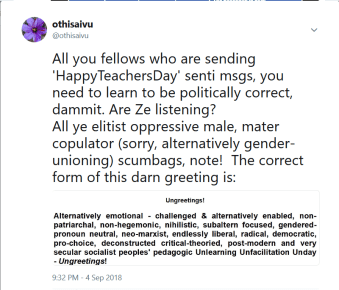 பொதுவாக, என்னுடைய பழைய மாணவர்கள்(பாவப்பட்ட ஜந்துக்கள்தாம்!) எனக்கு இப்படியெல்லாம் எழவெடுத்த வாழ்த்துகளை அனுப்பமாட்டார்கள். ஏனெனில், வேலைவெட்டியில்லாமல் கண்டமேனிக்கும் சடங்காகச் செய்யப்படும் அர்த்தமற்ற வாழ்த்துமுதல்வாதத்தை நான் பொதுவாகவே விரும்புபவனல்லன் – ஆகவே தீய்த்துவிடுவேன் எனத் தெரியும்.