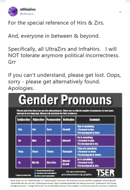 அதற்கு அவன் – “என்னை நீங்கள் பெண் என்று கருதவேண்டும் என நான் உரிமை கோர எனக்குச் சுதந்திரம் இருக்கிறது. இல்லையேல், பொதுவாக என்னை ze எனக் குறிப்பிடலாம்!”