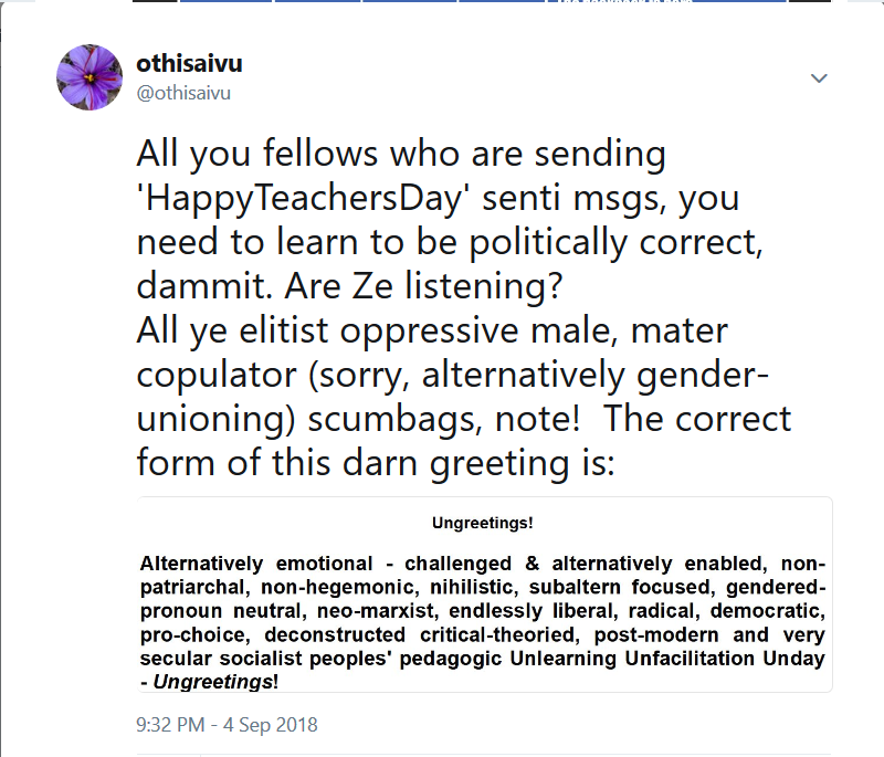 பொதுவாக, என்னுடைய பழைய மாணவர்கள்(பாவப்பட்ட ஜந்துக்கள்தாம்!) எனக்கு இப்படியெல்லாம் எழவெடுத்த வாழ்த்துகளை அனுப்பமாட்டார்கள். ஏனெனில், வேலைவெட்டியில்லாமல் கண்டமேனிக்கும் சடங்காகச் செய்யப்படும் அர்த்தமற்ற வாழ்த்துமுதல்வாதத்தை நான் பொதுவாகவே விரும்புபவனல்லன் – ஆகவே தீய்த்துவிடுவேன் எனத் தெரியும்.
