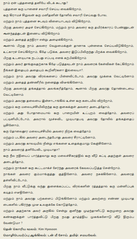 அப்படியே யாராவது, ங்ஙொம்மாள, தப்பித் தவறி அழுதிருந்தாலும் – அது என்ன கவிதை, அதன் பாடுபொருள் என்ன, புத்தருக்கும் அக்கவிதையில் சொல்லப்பட்ட/கோடிகாட்டப்பட்ட நிகழ்வுகளுக்கும் உள்ள பின்புலம் என்ன, கொரிய பௌத்தத்தின் கூறுகள் யாவை, அதன் பாரம்பரியம் என்ன, இந்தக் கவிதாயினி (அவரை ஒரு கவிதாயினி என ஒப்புக்கொள்ள முடியுமானால்) ஏன் இதனை எழுதினார், மூலகவிதையின் சொற்கட்டு எப்படி, ஊடுமொழியின் சொற்கட்டு எப்படிக் கவிதையை மாற்றும், மூலத்தில் உள்ள படிமங்கள் என்ன, அவற்றைத் தமிழ்ப் படுத்தி எடுக்கமுடியுமா… … … என்றெல்லாம் ஒரு மசுத்துக்கும் தெரிந்துகொள்ளாமல் ஆய்ந்தறியாமல் இப்படியா பட்டர் சிக்கன் பன்னீர் பட்டர் மசாலா தயிர் லஸ்ஸீ தயிர் வடை தேசிகன் என்றெல்லாம் பெயர்ப்பது?