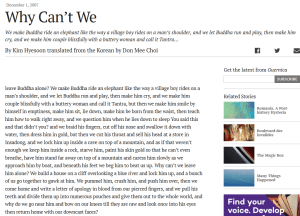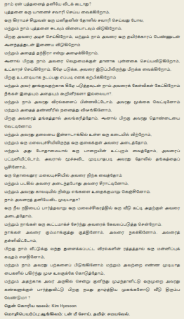 மேற்கண்ட பெயர்ப்பின் ஆங்கிலமூலம் (முழுமூலம் கொரியமொழியில்) – இதனை உங்கள் சரிபார்த்தலுக்காக, குறிப்புகளின் முழுமைக்காகக் கொடுக்கிறேன். ஆனால், படிக்கவேண்டிய அவசியம் இல்லை. ஏனெனில் இதில் நகைச்சுவை இல்லை, சரியா?