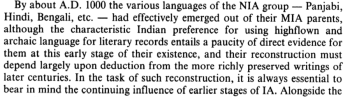 க்றிஸ்டொஃபர் ஷாக்கிள், ரூபர்ட் ஸ்னெல் போன்ற அறிவார்ந்த ஆய்வாளர்களின் கருத்து என்னவென்றால் – மத்தியகால இந்தோஐரோப்பிய மொழிகளிலில் இருந்து பொதுவருடம் 1000 போல (அதாவது சுமார் ஆயிரம் வருடங்களுக்கு முன்பே) ஹிந்தி உள்ளிட்ட அண்மைய இந்தோஐரோப்பிய மொழிகள் பிரிய ஆரம்பித்துவிட்டன. ஆனால் இவற்றுக்கான ருசுக்கள், பிற்காலத்தில் அவை சுட்டப்படுவதால் மட்டுமே கிடைக்கின்றன. (தத்பாவம் தத்ஸாமம் தொடர்புள்ள வார்த்தைகள், அவற்றின் வளர்ச்சி எனவெல்லாம் எழுதிக்கொண்டே போகலாம் – ஆனால், இப்போது வேண்டாம்)