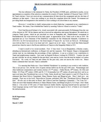 தி.மு.க தலைவர் மு.க.ஸ்டாலின் சென்ற சனிக்கிழமை ( 02. 03.2019) அன்று வெளியிட்ட அறிக்கையில், “வேதங்களில் இருந்து திருக்குறள் வந்தது என்று திருவள்ளுவரை சிறுமைப்படுத்தி, முன்னாள் தொல்லியல் அதிகாரி நாகசாமி திரிபு வாதத்தை முன்வைத்ததாகவும், அவருக்கு செம்மொழி தமிழாய்வு நிறுவனத்தின் சார்பில் வழங்கப்படும் ‘குடியரசுத் தலைவர் விருதுகளை’ தேர்வு செய்யும் கமிட்டியில் உறுப்பினராக நியமித்திருப்பதற்கு திமுக சார்பில் கடும் கண்டனத்தை தெரிவித்துக் கொள்வதாகவும், நாகசாமியை அந்த பணியிலிருந்து நீக்க வேண்டும் என்றும் கூறியிருந்தார்.