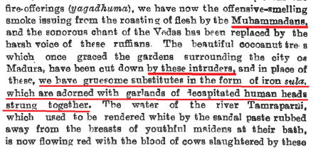 …மதுரையைச் சூழ்ந்திருந்த அழகான தென்னைமரச்சோலைகள், ஆக்கிரமிப்பாளர்களால் வெட்டப்பட்டு அவற்றின் இடத்தில் சூலங்கள் [வேல்கள்] சொருகப்பட்டு, அவற்றிலிருந்து, வெட்டப்பட்ட தலைகளால் தொடுக்கப்பட்ட மாலைகள் தொங்குகின்றன…