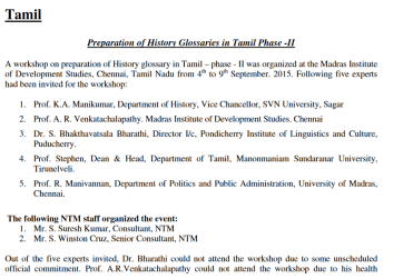 அக்டோபர் 7-9, 2013 சென்னை மிட்ஸ் நிறுவனத்தில் நடந்த என்டிஎம் கலைச்சொல் பணிமனையில் ஆஇராவேங்கடாசலபதி, கே ஏ மணிகுமார் (மனோன்மணியம் சுந்தரனார் பல்கலைக் கழகம்), பக்தவத்ஸல பாரதி (புதுச்சேரி) போன்றவர்கள் துறை வல்லுநர்களாகக் கலந்துகொள்கின்றனர். வரலாற்றுச் சொற்களின் மீதுதான் குவியம்.