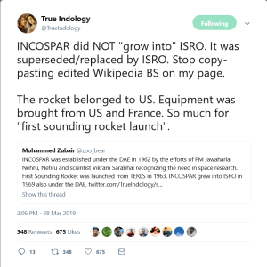 A fine twitter handle, @TrueIndology said the following about ISRO – debunking the narrative peddled by illiterate propagandists of Congress/Liberals & ‘Nehru did EVERYTHING and was responsible for anything positive about India, that’s even worth mentioning!’ brigade of whitewashers.