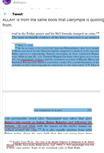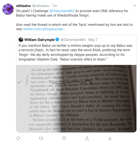 …Because Dalrymple has NOT read the originals of Baburnama (am doubtful whether he has even read the whole of any english translation of Tuzuk-i-Baburi) he says fanciful things; Insha allah appears manytimes in it. Even in the Annette Susannah Beveridge translation it does. Especially in the second volume.