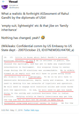 OK. This is a capture of a series of tweets – culled from a few of the wikileaks releases, along with my annotations. These releases were confidential/secret internal documentations that were filed by the New Delhi embassy diplomats of USA. They are very realistic & on the dot.