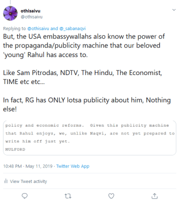 But, the USA diplomats can also see the power of propaganda that could help Rahul.