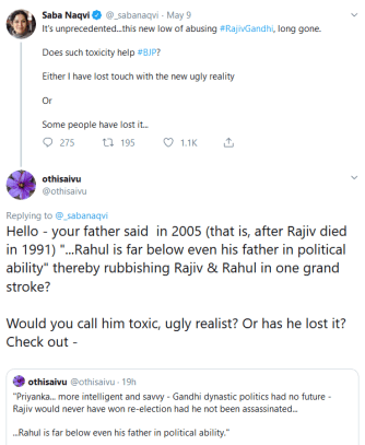 In the mean time, the Lutyenswali Grand Ma’am Saba Naqui tweeted about the “new low of abusing Rajiv who is long gone.”