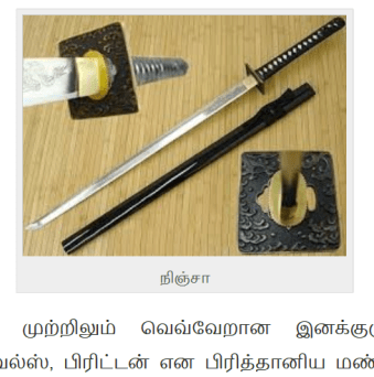Ninja or ninjaken is a Japanese sword used by the Shinobi class of feudal Japan என்று குறிப்பிடப்பட்டுள்ளதைப் பார்த்தேன் ஒருவேளை சிறிய வட்டத்தில் அவ்வாறு நிஞ்சா வாட்களையே நிஞ்சா எனக் குறிப்பிட்டிருப்பார்களோ?