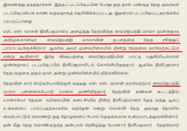 சந்தடிசாக்கில் வைஜயந்திமாலாவின் பாட்டியான ‘யதுகிரி தேவி’யை, டமாலென்று பாரதியார் தொடர்புடைய ‘யதுகிரி அம்மாள்’ ஆக்கிவிட்டார்வேறு! வைஜயந்திமாலா ஒரு சுதந்திரப் போராட்டவீராங்கனை, பாரதியின் கண்ணம்மா ஆக்சுவலா வைஜயந்திமாலா எனவெல்லாம் ஊக்கபோனஸ்ஸாக அட்ச்சிவுடவில்லை என்பதற்கு அவருக்கு நன்றி சொல்வதைத் தவிர, வேறு எதுவும் செய்வதற்கு எனக்குத் திராணியே இல்லை!