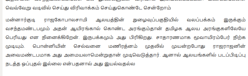 “மன்னார்குடி ராஜகோபாலசாமி ஆலயத்தின் நுழைவுப்பகுதியில் வலப்பக்கம் இருக்கும் வசந்தமண்டபமும் அதன் ஆயிரங்கால் கொண்ட அரங்கும்தான் தமிழக ஆலய அரங்குகளிலேயே பெரியது என நினைக்கிறேன். இருபக்கமும் அது பிரிகிறது. சாதாரணமாக மூவாயிரம்பேர் நிற்க முடியும். பொன்னியின் செல்வனை மணிரத்னம் முதலில் முயன்றபோது ராஜராஜனின் அவைமண்டபமாக அது அமையலாமென்றுதான் முடிவெடுத்தார். ஆனால் ஆலயங்களில் படப்பிடிப்பு நடத்த ஒப்புதல் இல்லை என்பதனால் அது இயல்வதல்ல”