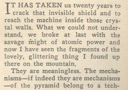 4. “மிகச்சரியான முக்கோண முப்பட்டை வடிவமானது” – :-( – மிகச்சரியாக, அது அப்படியில்லை. க்ளார்க் தெளிவாக அதனை பிரமிட் எனக் குறிப்பிடுகிறார். ப்ரிஸ்ம் என்றல்ல.
