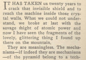 கதை, மானுடத் தொழில் நுட்பங்களுக்கு எட்டாத தொலைவில் அந்தக் கருவி இருப்பதாகச் சொல்கிறது… (இந்தக் க்ரிஸ்டல் அதன் லாட்டிஸ் தன்மையைக் குறிக்கிறது. படிமம் படிகாரம் படிகம் என்பதைப் பற்றியதல்ல!)
