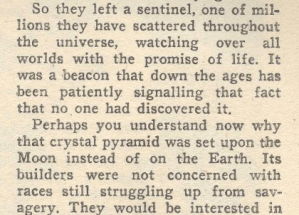 5. அது ஒரு வெறும் சின்னமல்ல. அது ஒரு அணுக்கருவுலை + கதிரியக்க அரண் கொண்டது + பலப்பல மில்லியன் வருடங்களாக செய்திகளை அது அனுப்பிக்கொண்டிருந்திருக்கிறது! மிகத் தெளிவாக அதனைப் பற்றிய குறிப்புகள், கதையில் இருக்கின்றன.
