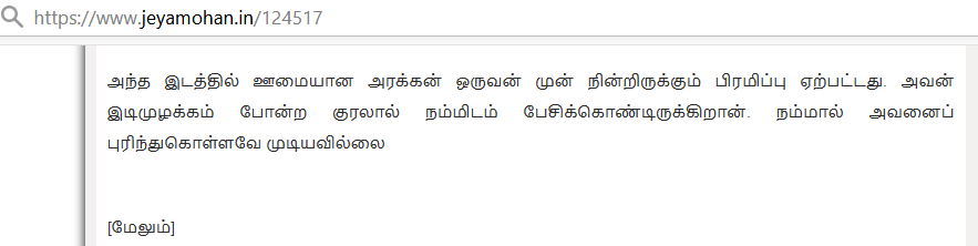 சரியான பதில்: யாராக வேண்டுமானாலும் இருக்கலாம். ஆனால் இதை எழுதியது ஜெயமோகன் அவர்கள். இன்னமும் சில ஆண்டுகளில், தமிழலக்கிய மெகா மும்மூர்த்திகளும் ஒருங்கிணைந்து ரவுண்ட் கட்டிக்கினு நம்மை மிகக் கொடூரமாகத் தொடர்ந்து, பேய்கள் போலத் தாக்கப் போவதற்கு இது கட்டியம் கூறுகிறது என்பதை மட்டும் கூறிக்கொள்கிறேன். உங்களுக்கும் நடுக்கமாக இருக்கிறது அல்லவா?