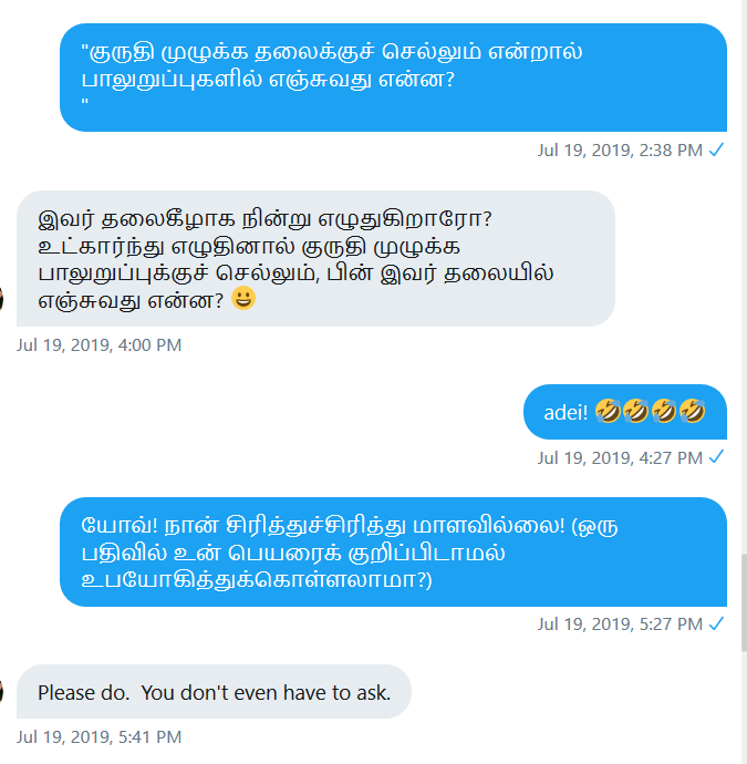 பின்குறிப்பு: அடியேனுடைய ஆழ்ந்த விருப்பம் என்னவென்றால், பெரும்பேராசான் மாதத்துக்கு ஒருமுறையாவது ஷிரசாஸனம் செய்துகொண்டே ஒரேயோரு கட்டுரையை எழுதினால், உடனே அதனைப் படிக்காமலேயேகூட அதனைப் புகழத் தயார். ஏனெனில், அப்ரசண்டியான நான் அப்படி எழுதினால்கூடத் தரமாக இருக்கும் எனத்தான் நினைக்கிறேன். நன்றி.