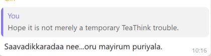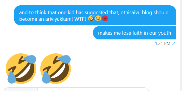 அதேசமயம் – இந்த ஒத்திசைவு எழவால் பலப்பல புது அறிமுகங்களையும் சிலபல நல்ல நண்பர்களையும் ஸஹ்ருதயர்களையும் பெற்றுக்கொண்டேன் (இத்தனைக்கும் அவர்கள் பலரின் முகத்தைக் கூடப் பார்த்ததில்லை!) என்பதைச் சொல்லாவிட்டால் கொள்ளையில், பேதியில் தான் போவேன் என்பதும் உண்மை.