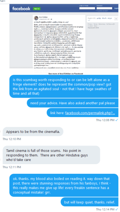 சில நாட்களுக்கு முன் இன்னொரு திரைப்படத் தண்டகருமாந்திரம் குறித்து (=’அருள் எழிலன்’) ஒரு அன்பரிடம் இருந்து ஒரு ஸ்க்ரீன்ஷாட் வந்தது. அதனைப் பற்றி எழுதலாமா வேண்டாமா என என் ஆப்த நண்பர் ஒருவரிடம் கேட்டபோது அவர் வேண்டாமென்றார்.