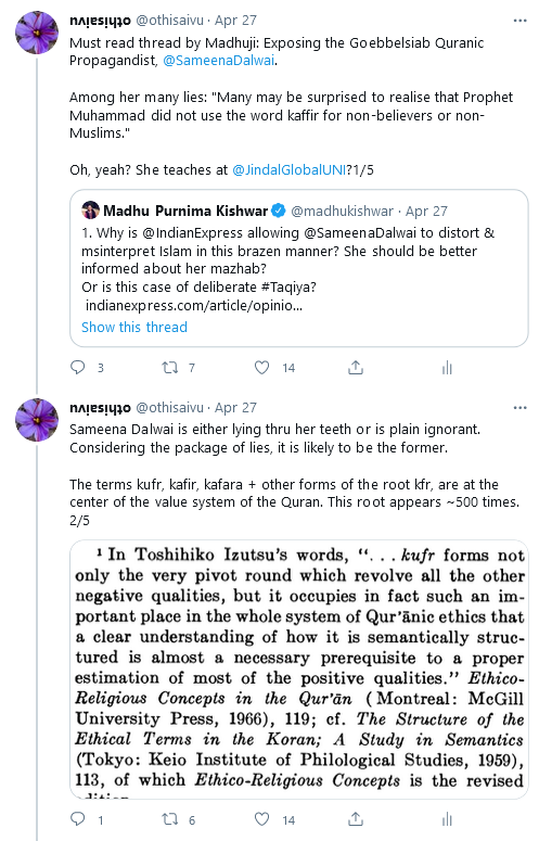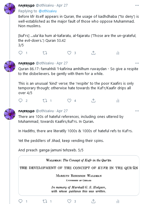 I wrote a Twitter thread about ‘the hateful reference to Kuf’rs in Quran‘ in response to a thread by Madhu Purnima Kishwar. Madhuji wrote about that despicable Sameena Dalwai essay in Indian Express; relevant screenshots below: