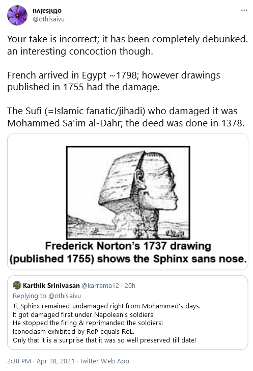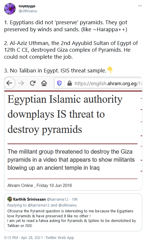 The civilisation of the Pyramids does not exist today, so the urge to deface/erase out a remnants of a non-competing civilisation may have been relatively – அதாவது, relatively – muted.