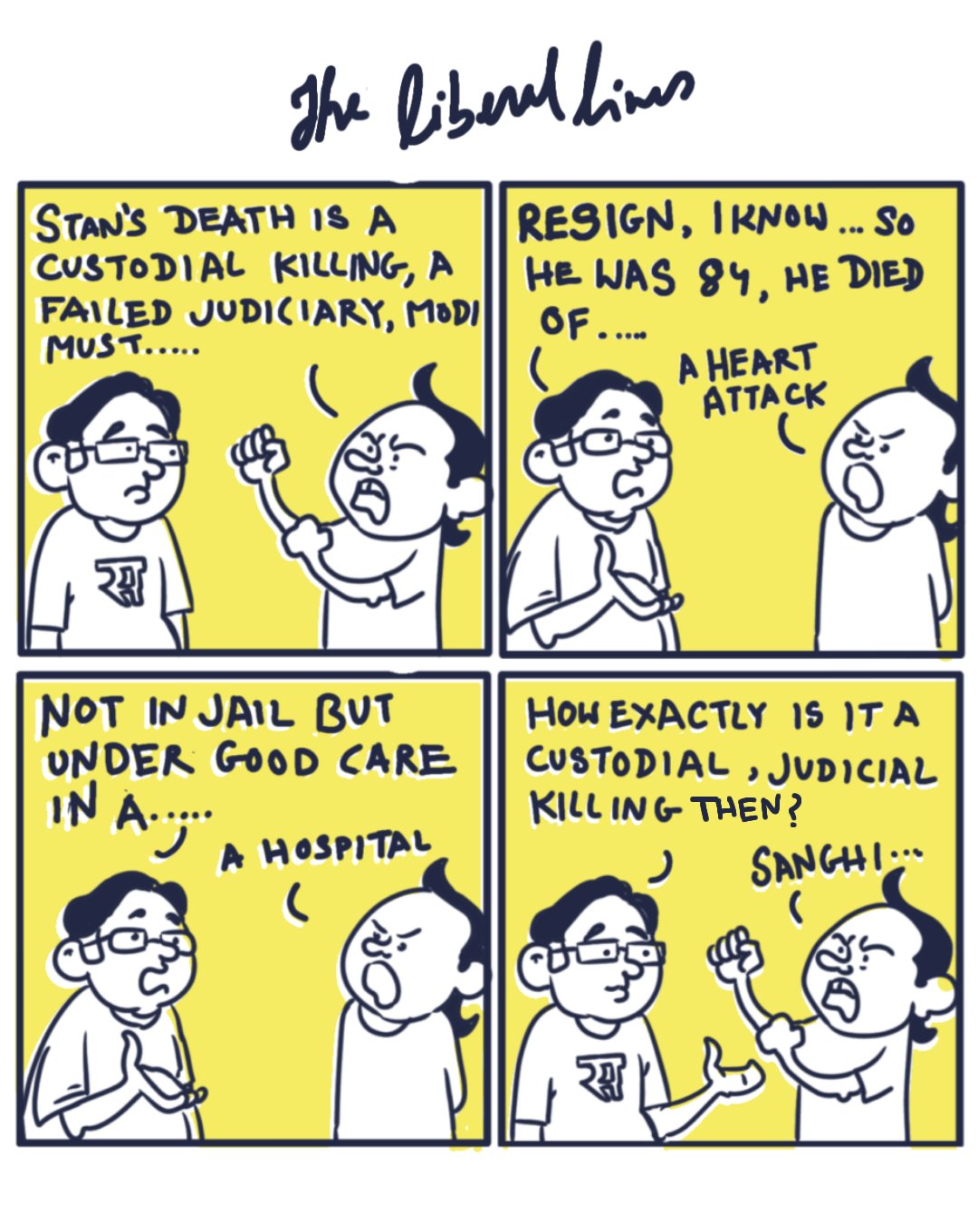சாகிற வரையில், கொஞ்சம்கூடக் கூச்சமே இல்லாமல் தொடர்ந்து விதம்விதமாகப் புளுகிக் கொண்டே இருந்தவர் (“ஐயகோ, இக்கொடுமையைப் பாரீர்! என்னுடைய செல்லங்களான ஸ்ட்ராவையும்  (‘உறிஞ்சி’) ஸிப்பரையும் எனக்குச் சிறையில் கொடுக்கவில்லை, ஓவ் ஓவ்!“) இந்த ஸ்டேன் சாமி.