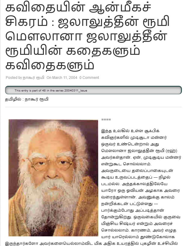 ஸூஃபிகளின் ஆன்மிக உச்சங்களில் ஒருவர் என அபாண்டமாகக் குற்றம் சாட்டப் படும் ஜலாலுத்தீன் ரூமி பற்றி ஒத்திசைவில் எழுதப் பட்ட ஒரு பழைய கட்டுரை: இதுதாண்டா ஸூஃபி! இவ்ளோதாண்டா ரூமி!! 12/03/2020